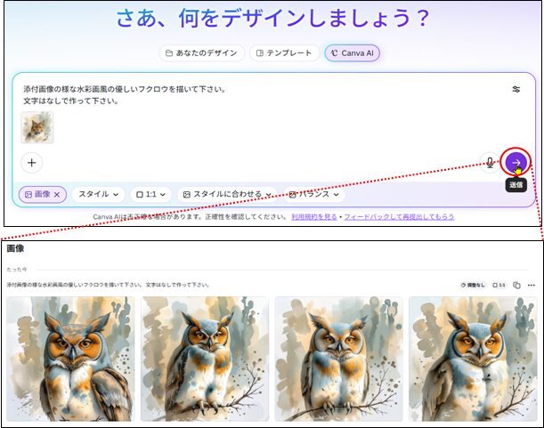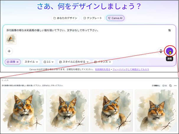 2枚目以降は、同じタッチの画像を生成してもらう為、1枚目の画像を添付して、指示します。
