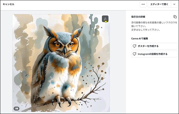 先ほど作成したフレーズを付けて、水彩画風の鳥のイラストを描いてもらいます。