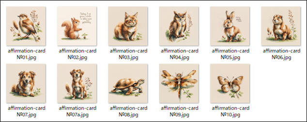 アファメーションカードに記載するフレーズと、イラスト画像が10個できましたので、次は、そのフレーズとイラスト画像をカードに貼り付けて、アファメーションカードを完成させます。