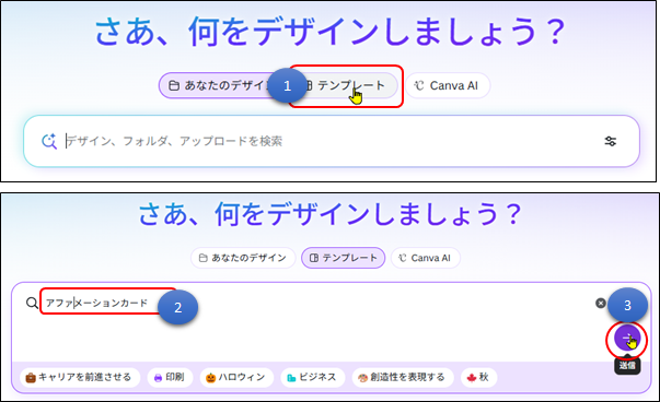 「テンプレート」をクリックして、アファメーションカードを検索します。