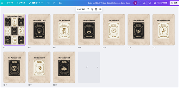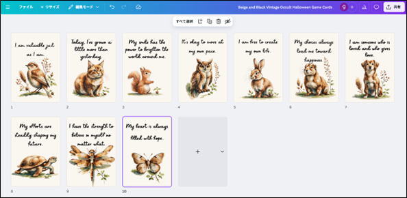 10枚のカードに、フレーズとイラスト画像を挿入しましたら、全体を確認して完成です。