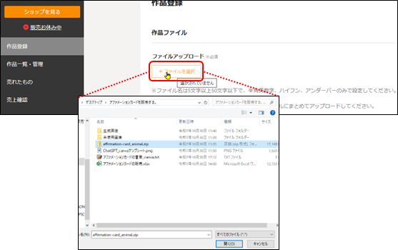 「ファイルを選択」をクリックして、ダウンロードしたZIPファイルを選択します。