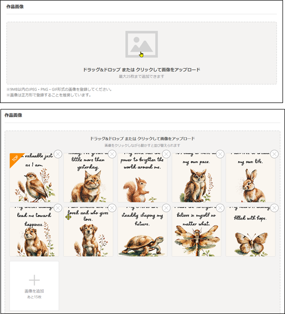作品画像は、10枚のJPEG又はPNGファイルをアップロードします。