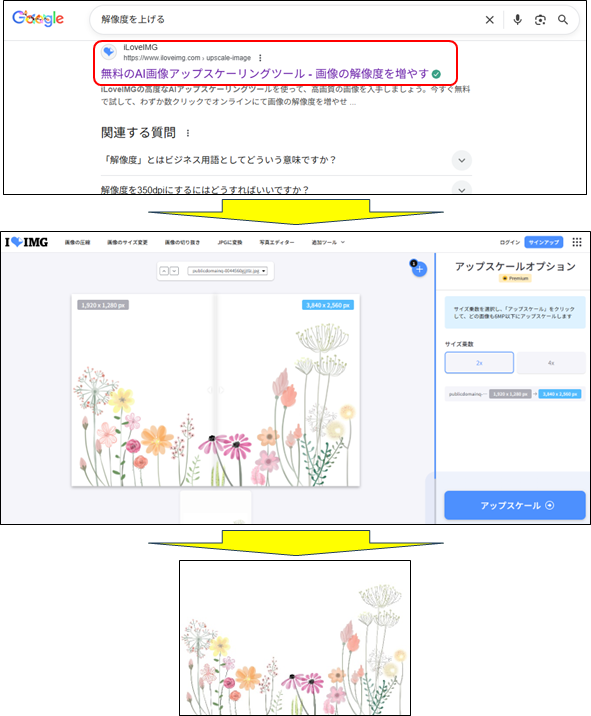 無料のアップスケールツールのILOVEIMGで、初回の解像度アップを図ります。