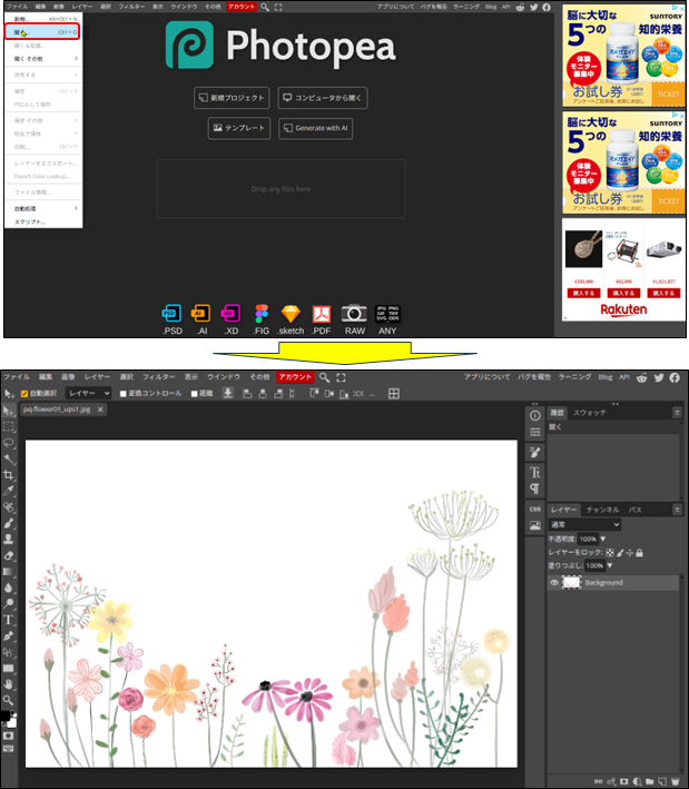 Photopeaでダウンロードした画像をアップロードします。