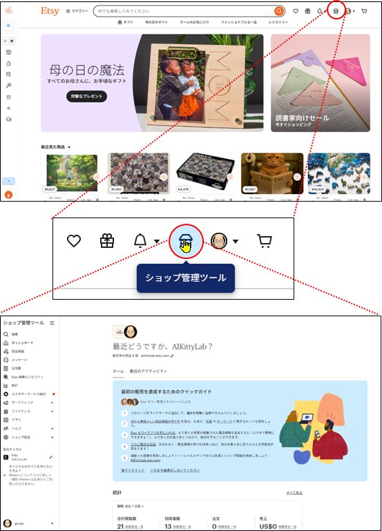 Etsyを起動して、「ショップ管理ツール」を開きます。