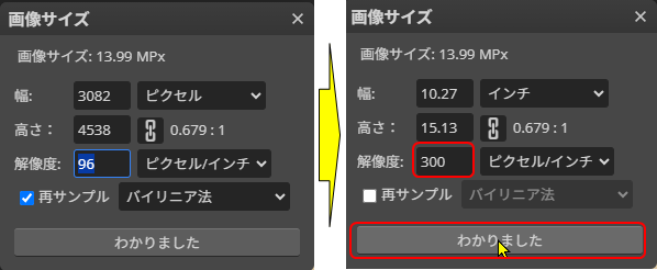 「解像度」を96から300に変更します。「再サンプル」の✓は外します。