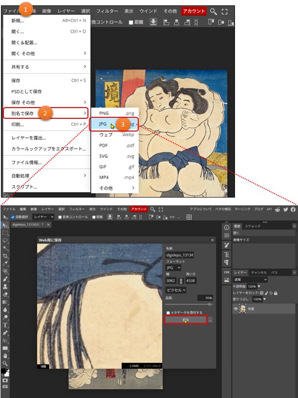 「ファイル」→「別名で保存」→「JPG」をクリックします。