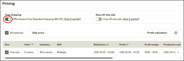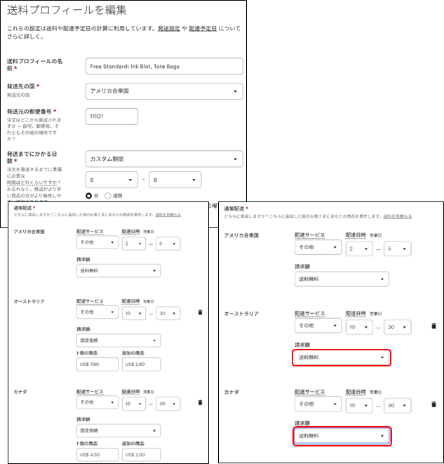 「送料無料」の設定を行う場合は、必ず、各国への送料を確認して設定して下さい。
