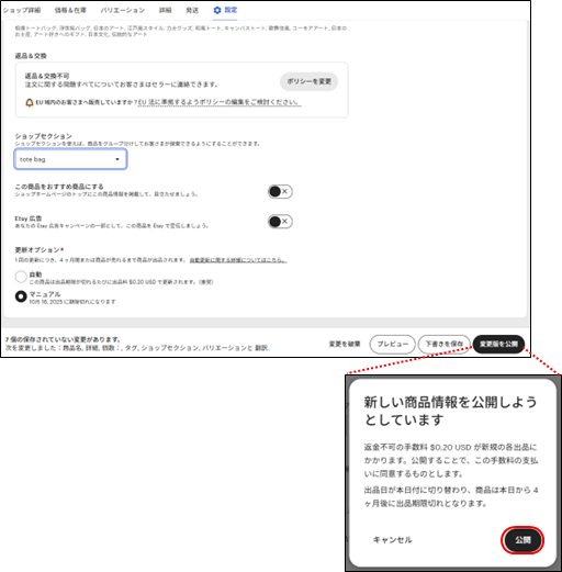 Etsyで確認して、下書きから公開にします。